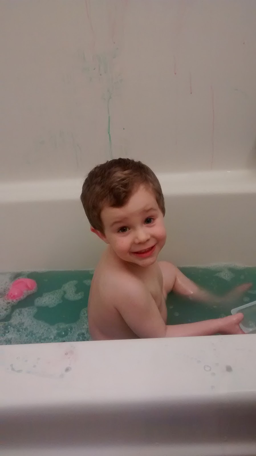 Oh this day. Shae went through four different pairs of pants in one day. Impressive. We all have our days. He was just so excited playing at Joy School that he couldn't control it and went, right at the end. Spilled lunch all over himself. Then, after falling asleep unexpectedly (aka: without going potty first) he wet himself and all his blankets and sheets during his nap. He went right to the tub when he woke up and got to enjoy his favorite after nap/quiet time treat, milk, in the tub.